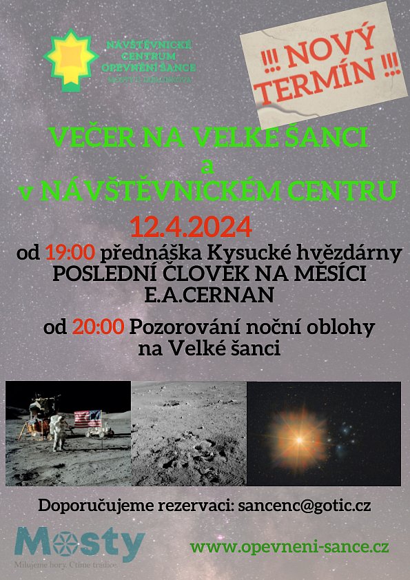 Nejdříve se díky přednášce "Poslední člověk na Měsíci E.A. Cernan" vrátíme do roku 1972 a podíváme na Měsíc. Zjistíme, že ten, kdo po něm kráčel jako poslední, měl své kořeny v nedaleké obci Vysoká nad Kysucou. Po přednášce se přesuneme ven do opevnění Velká šance a budeme pozorovat noční oblohu.